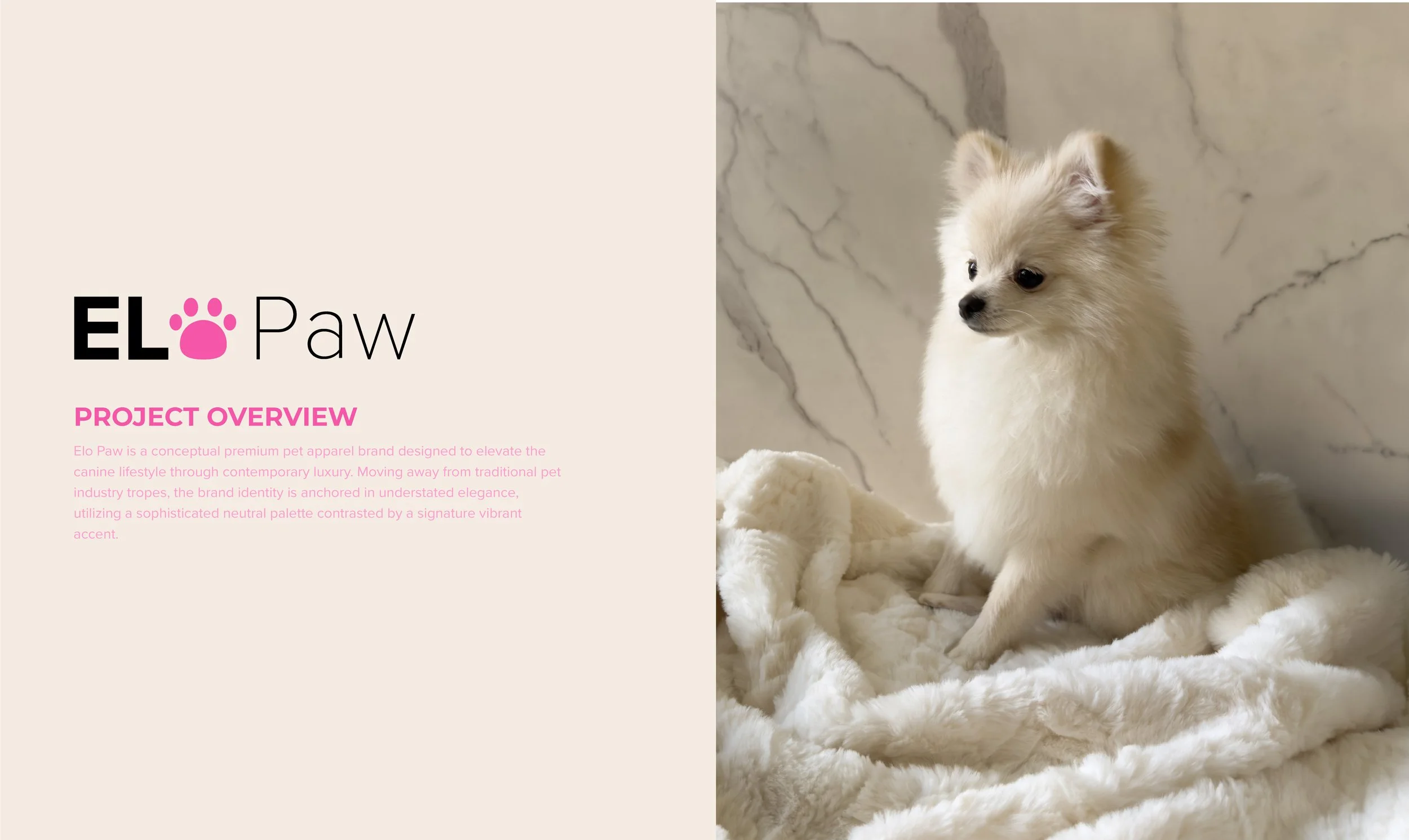 Elo Paw is a conceptual premium pet apparel brand designed for the modern pet lifestyle. The goal was to create a brand identity that feels elevated, refined, and fashion-forward while still feeling warm and approachable. Moving away from traditional, playful pet branding, the focus shifted to luxury presentation, premium materials, and production-ready retail design.